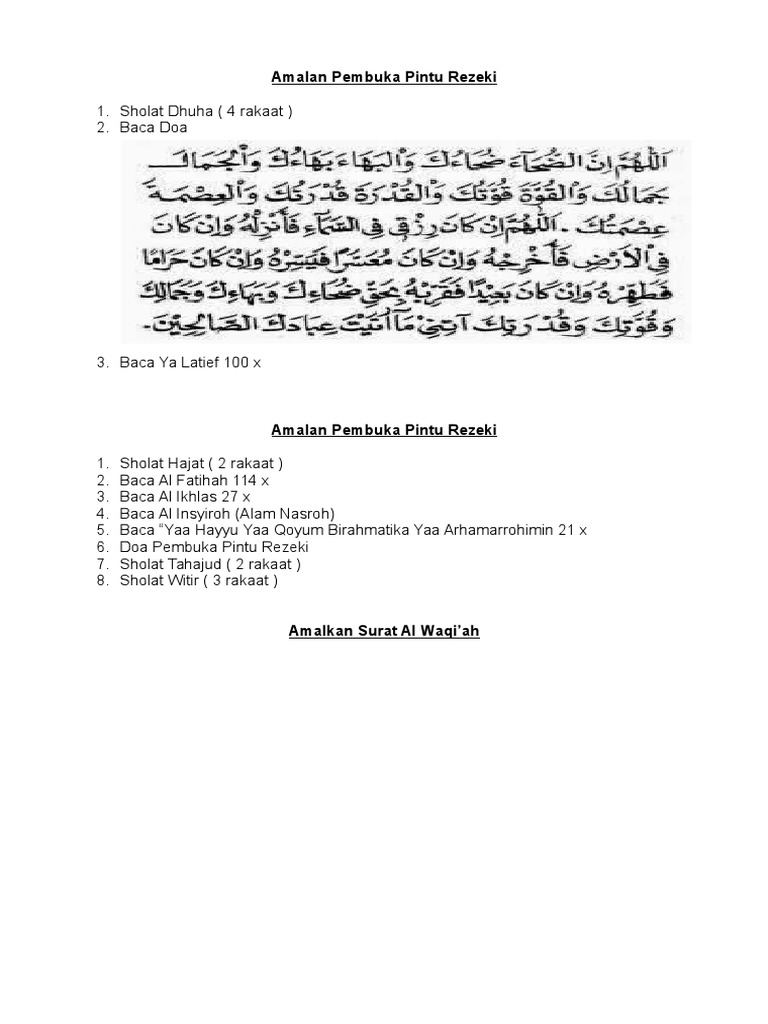 Cara sholat dhuha yang benar untuk membuka pintu rezeki. Untuk membuka pintu rezreki dan rahmat bagi keluarga ananda dengarkan dan bacalah tadabbur surat fathir 2 3 an nur 55 56 serya al fath 1 4 dioatas setiap selesai shalat subuh dan maghrib. Ini cwrita semuanya benar. Lakukan semua itu dengan tekun dan istiqomah insya allah ada perubahan dalam hidup ananda.
